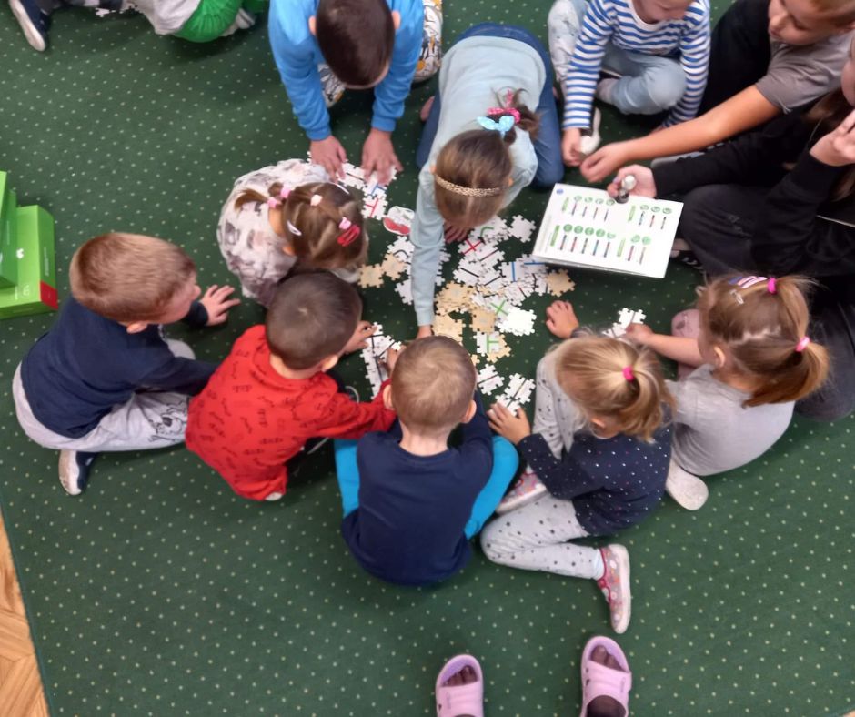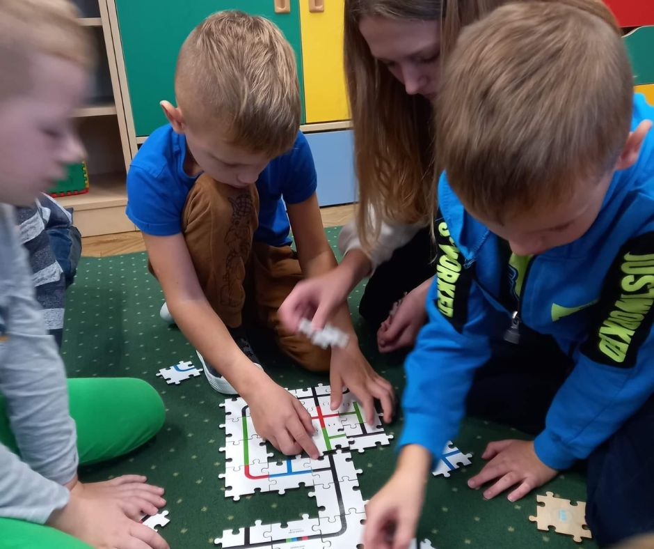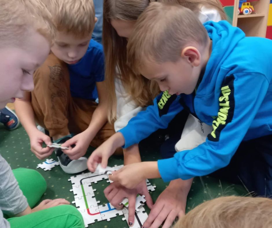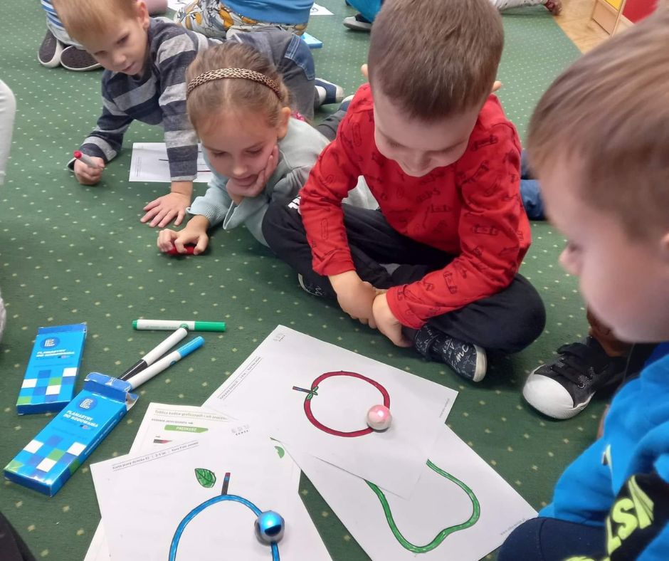 Europejski Tydzień Kodowania. Wraz z uczennicami klasy 8 porozmawialiśmy z przedszkolakami o darach jesieni, sprawdziliśmy znajomość grzybów. Następnie nasi milusińscy znakomicie poradzili sobie z programowaniem trasy dla ozobotów, rysując mazakami oraz układając puzzle.Przyjemnie patrzyło się na zaangażowanie młodych programistów