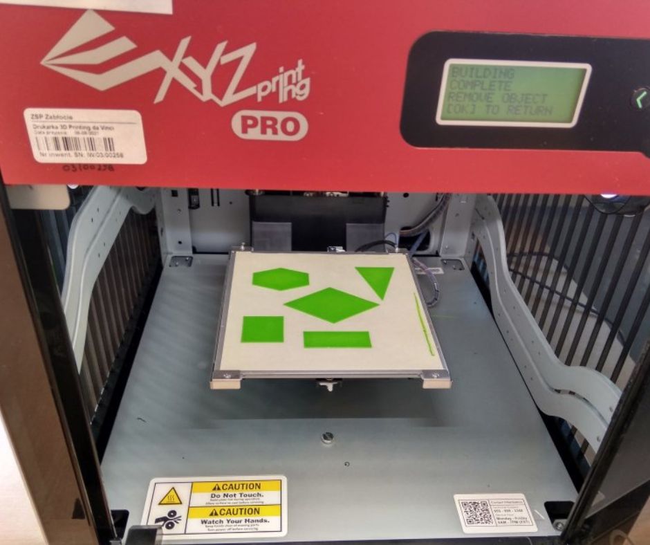 Pierwsze pomoce dydaktyczne do lekcji matematyki zostały wydrukowane na naszej szkolnej drukarce 3D. Mimo, iż są to tylko figury geometryczne, to najpierw należało je zaprojektować, a następnie dobrać odpowiednie temperatury extrudera i stołu.