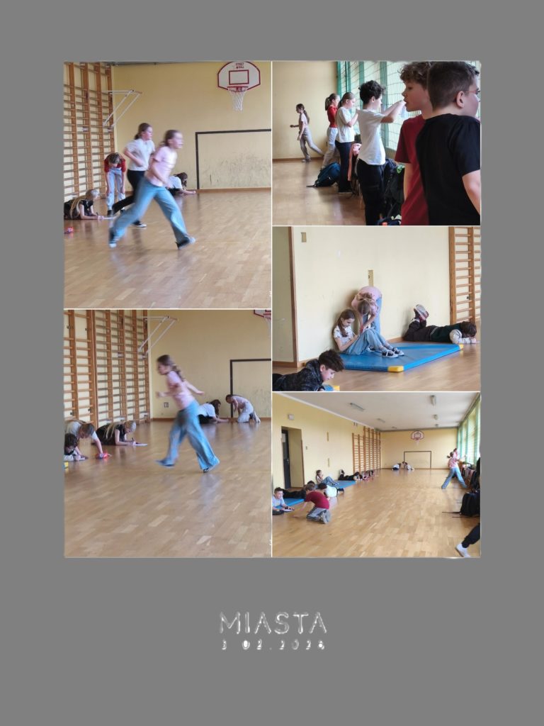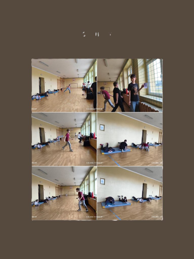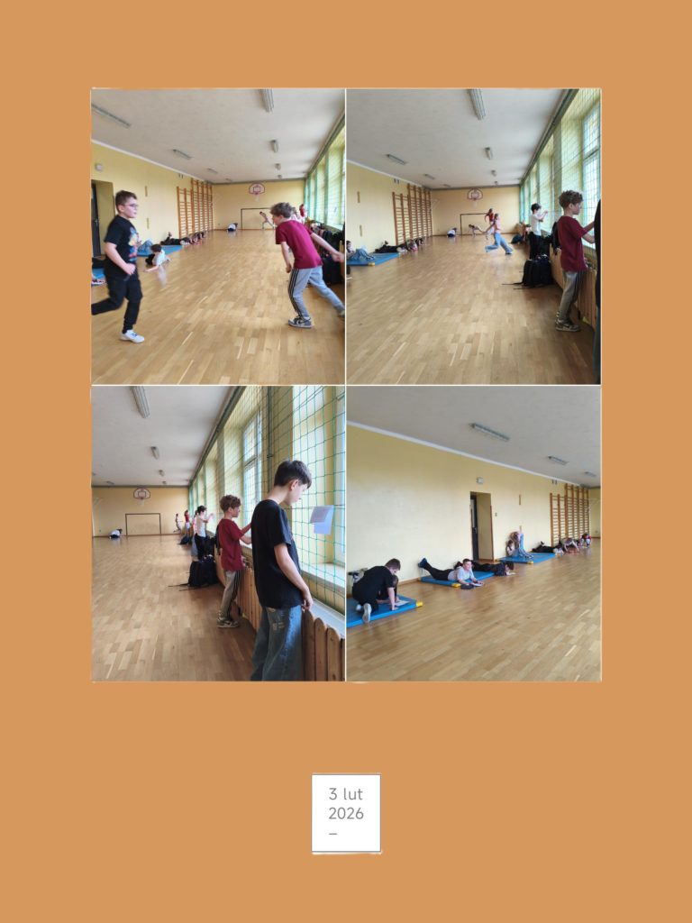 Na sali gimnastycznej odbyła się nietypowa lekcja języka polskiego pt. „Dyktando biegane”. Uczniowie klasy czwartej połączyli naukę ortografii z aktywnością ruchową, co okazało się świetnym sposobem na naukę przez zabawę.