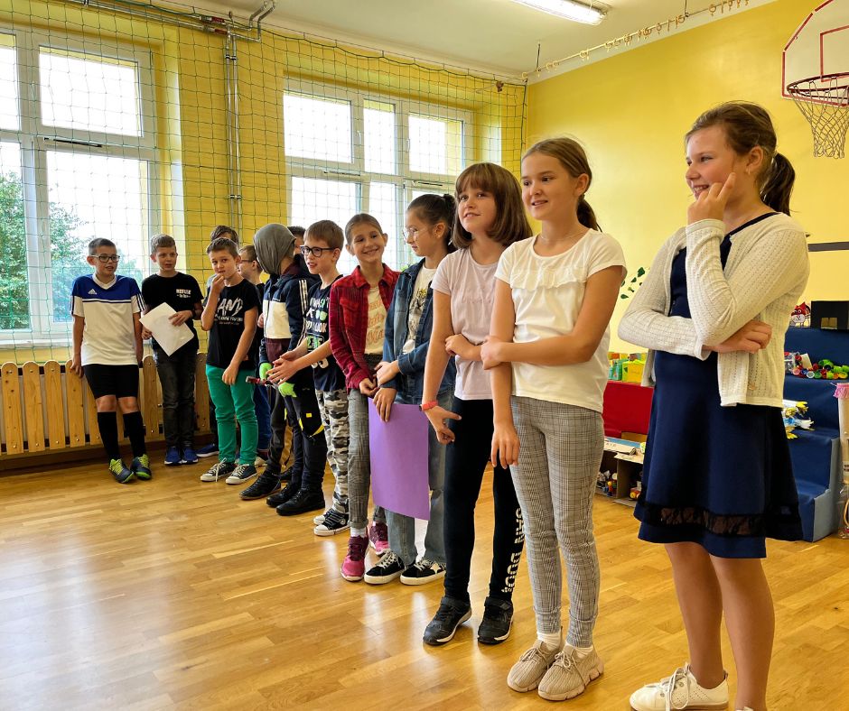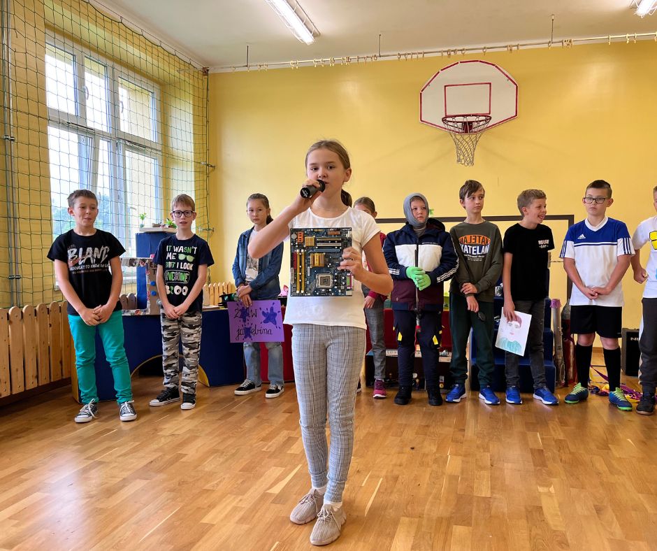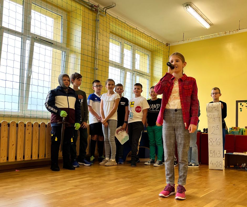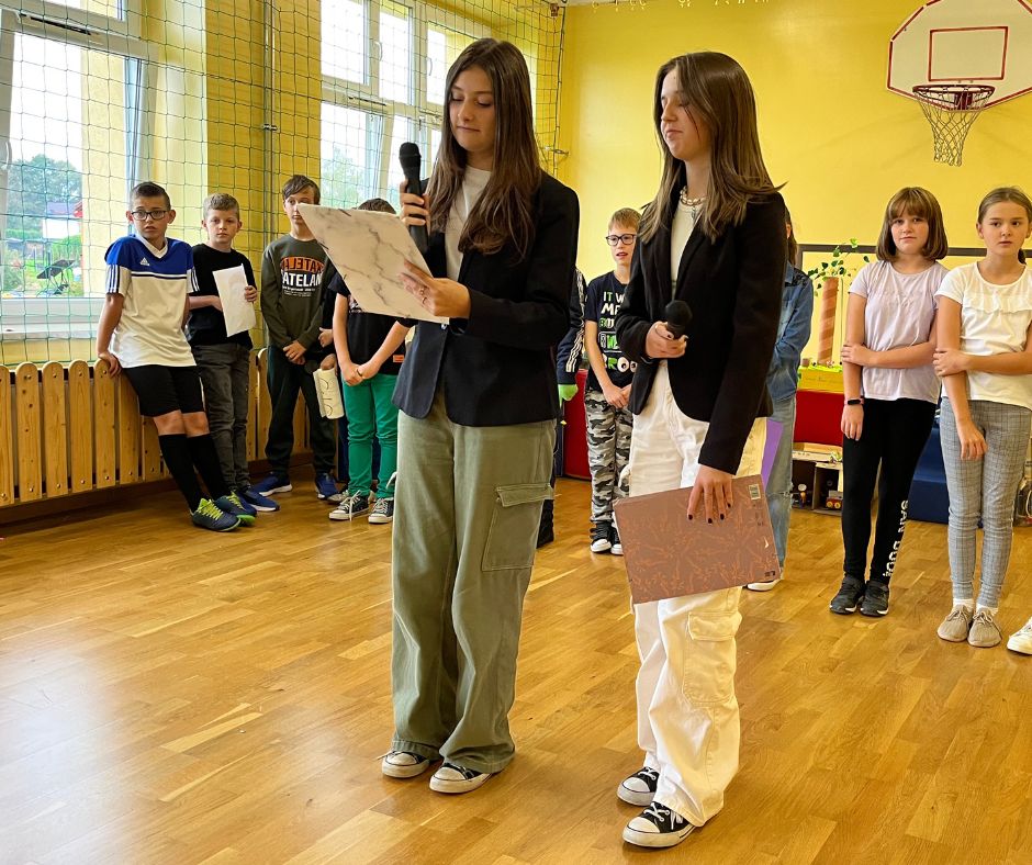 Czwartoklasiści w krótkich i zabawnych scenkach przedstawili jak wygląda obecnie ich nauka nowych przedmiotów. Odpowiedzieli również na pytania dotyczące znajomości szkoły przygotowane przez Samorząd Uczniowski. Na koniec złożyli uroczyste ślubowanie w obecności całej społeczności szkolnej.