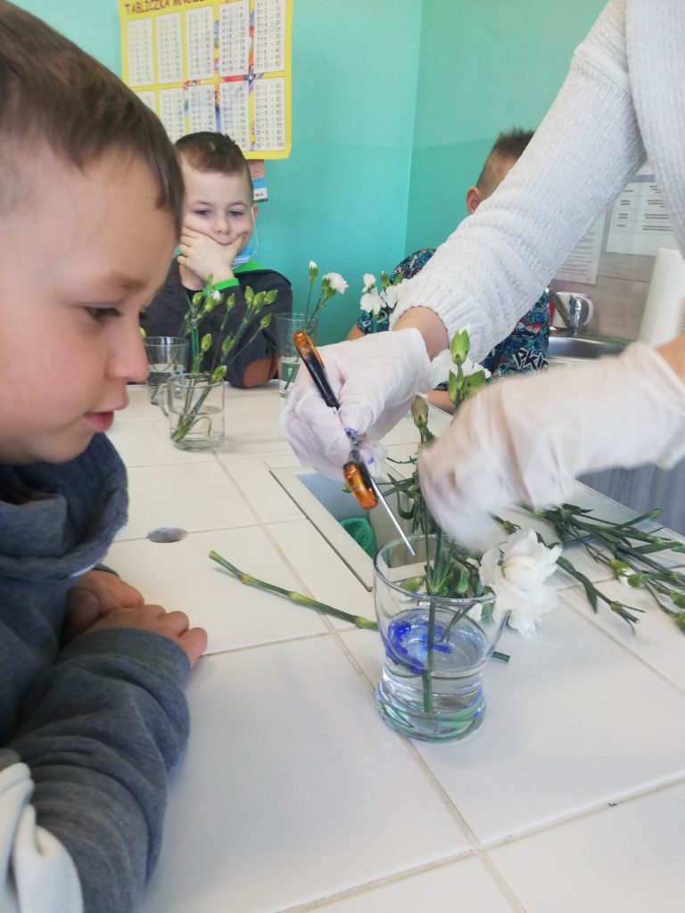 Wraz z nadejściem wiosny pojawił się u nas temat kwiatów. Sprawdziliśmy jak kwiaty cięte pobierają wodę i jak mogą one zmienić kolor w zależności od dodanego barwnika.