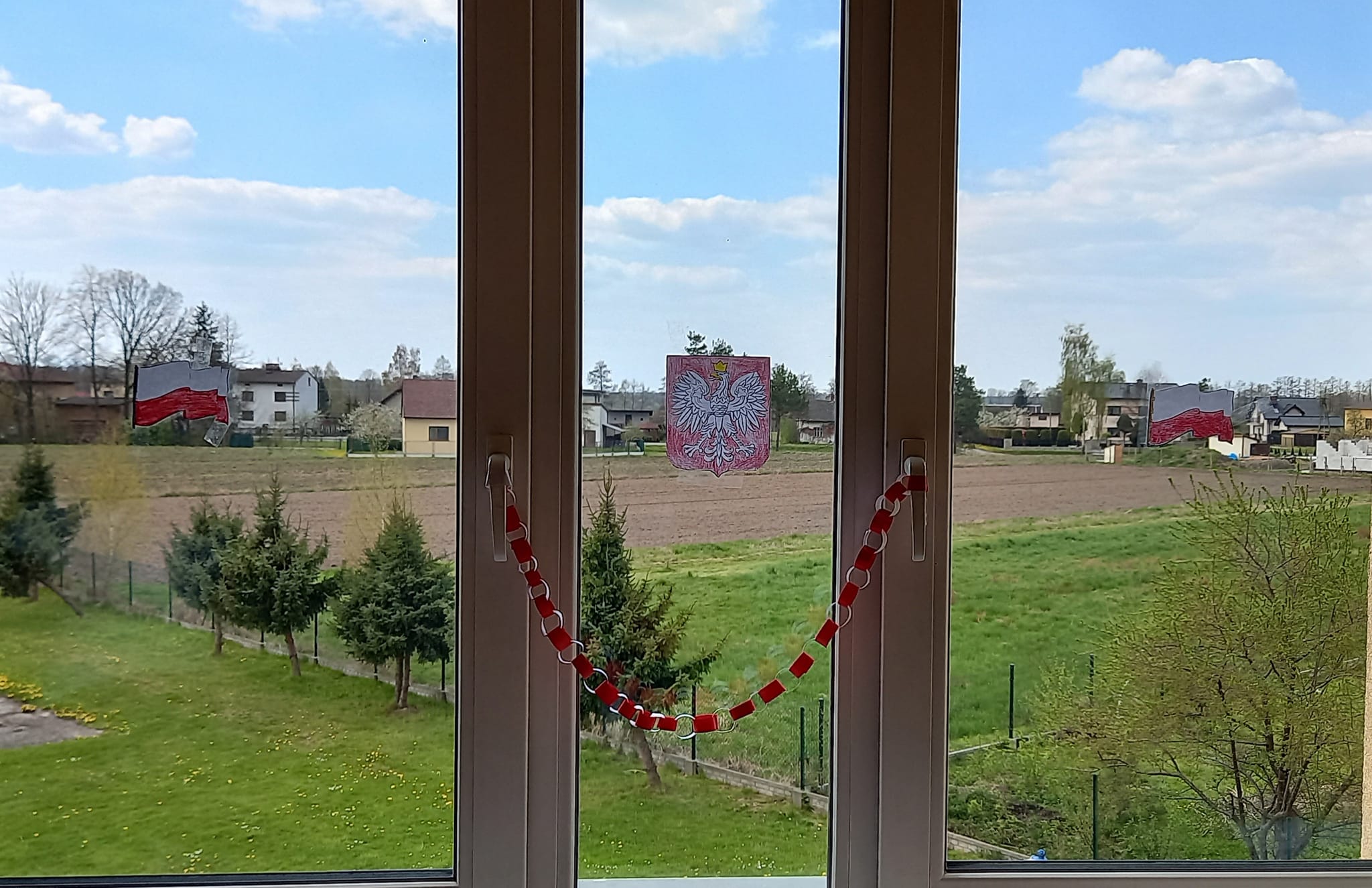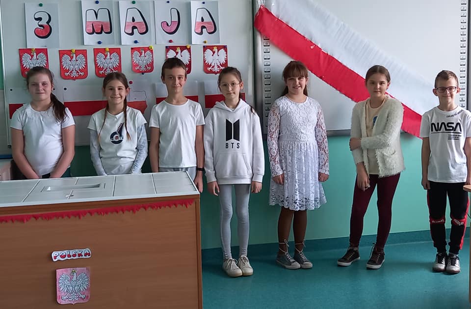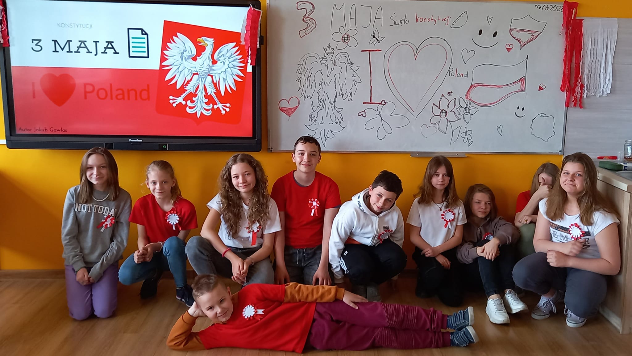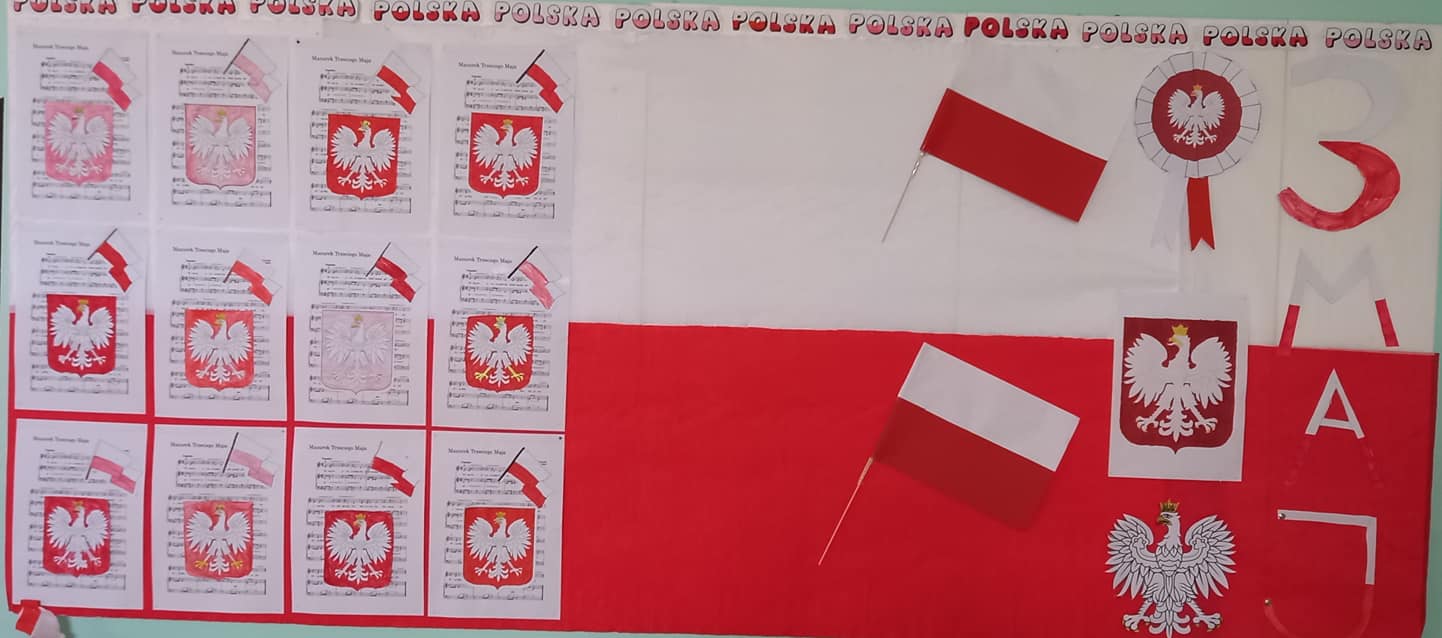 Ponieważ jest to dzień wolny więc postanowiliśmy już dziś uczcić to wydarzenie. Każda klasa ustroiła swoją salę oraz napisała list „Za co kocham moją ojczyznę”. Zwieńczeniem było wspólne zdjęcie tworzące naszą narodową flagę. Wyszło super!