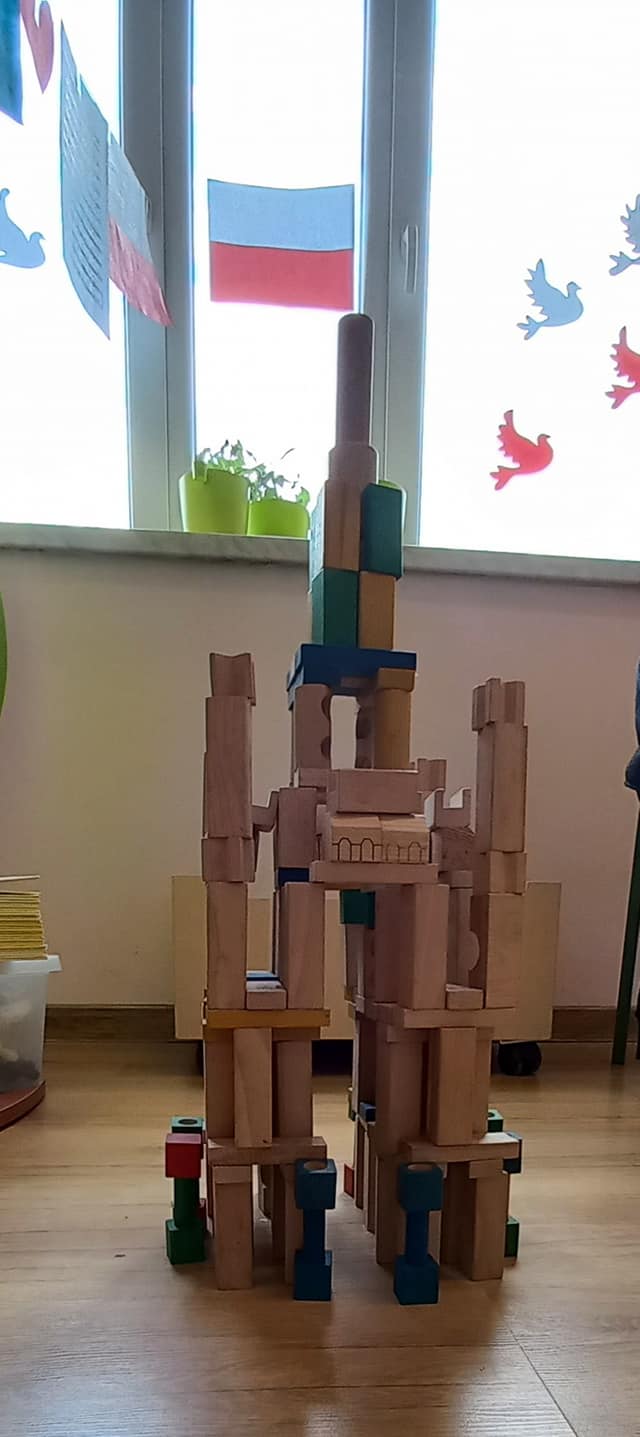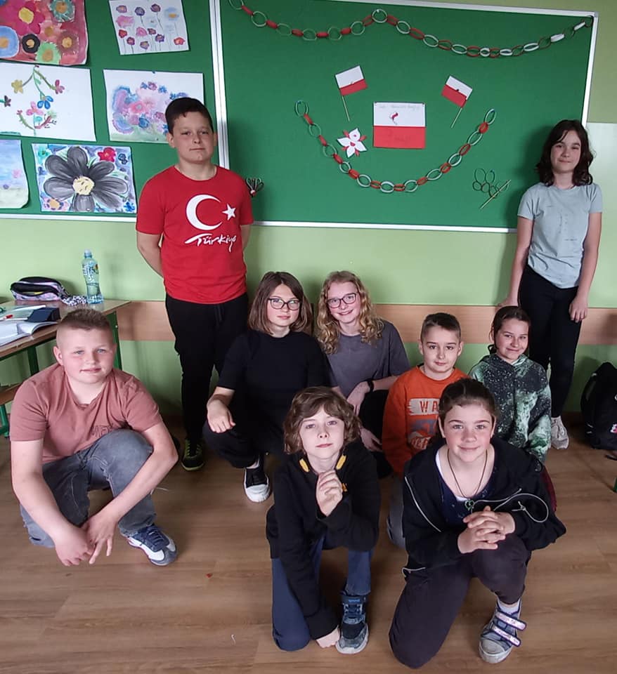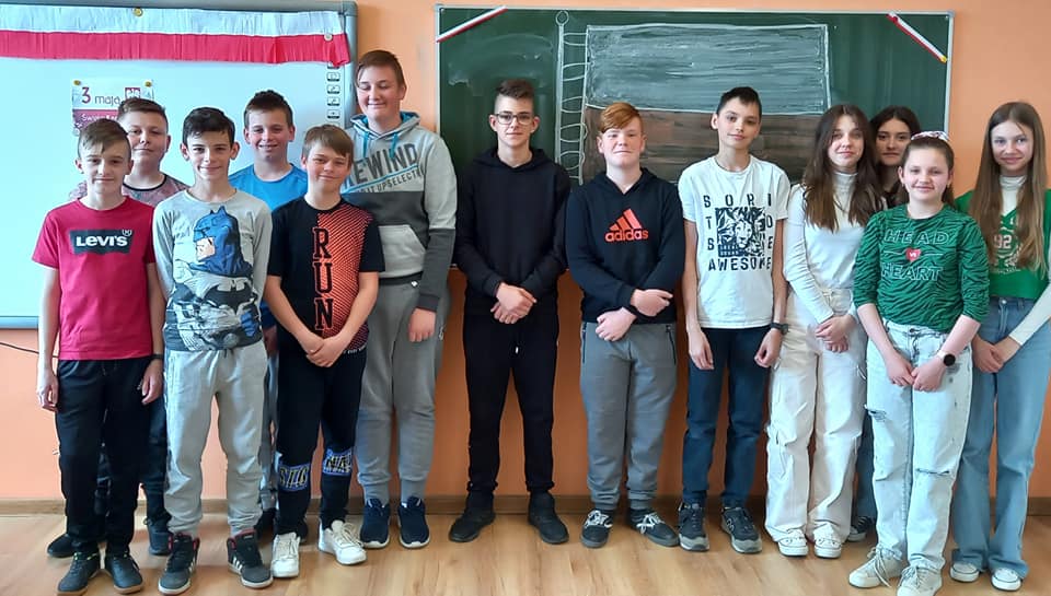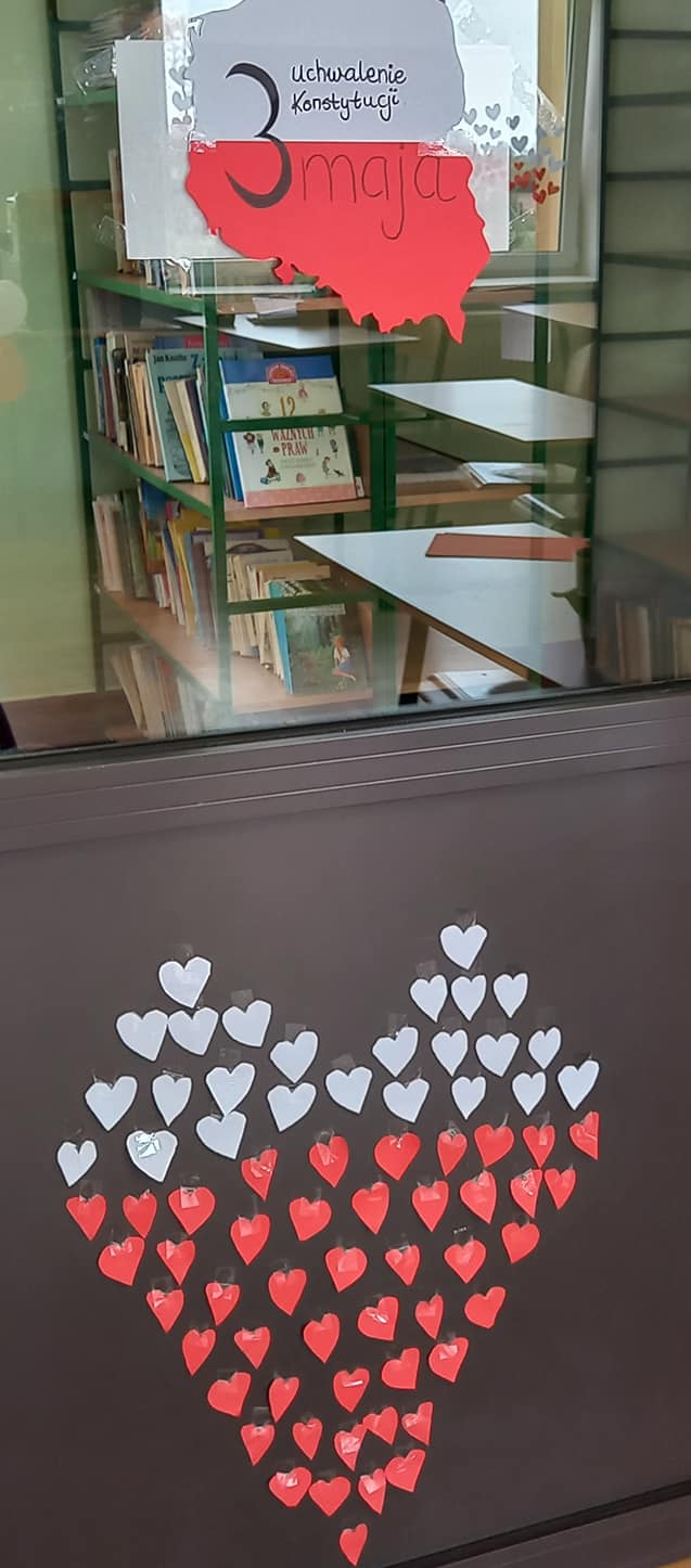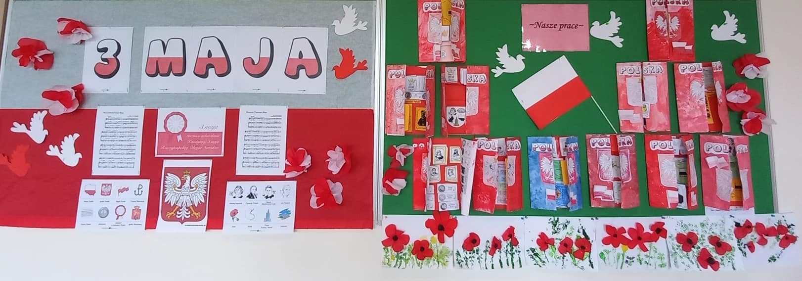 Ponieważ jest to dzień wolny więc postanowiliśmy już dziś uczcić to wydarzenie. Każda klasa ustroiła swoją salę oraz napisała list „Za co kocham moją ojczyznę”. Zwieńczeniem było wspólne zdjęcie tworzące naszą narodową flagę. Wyszło super!