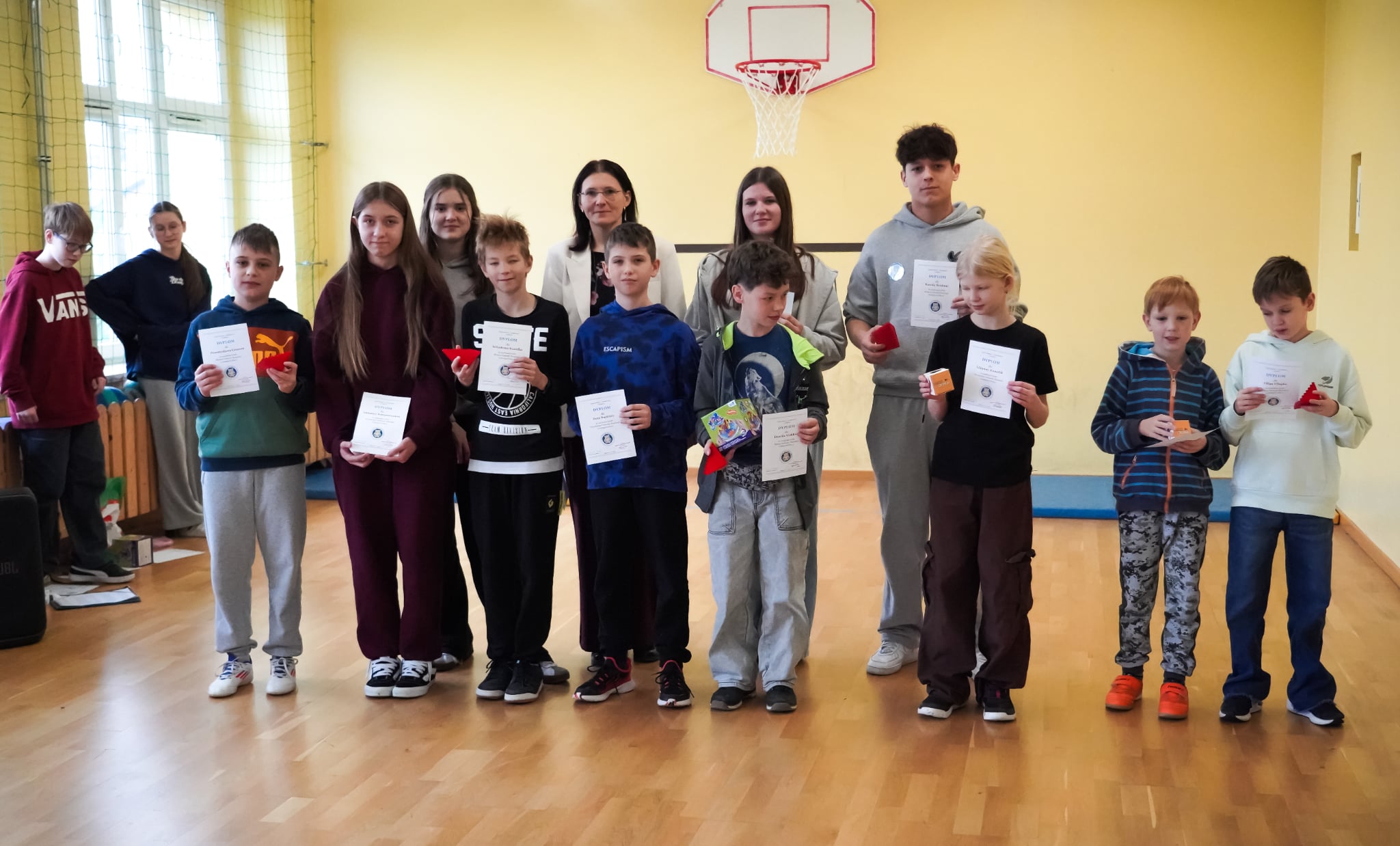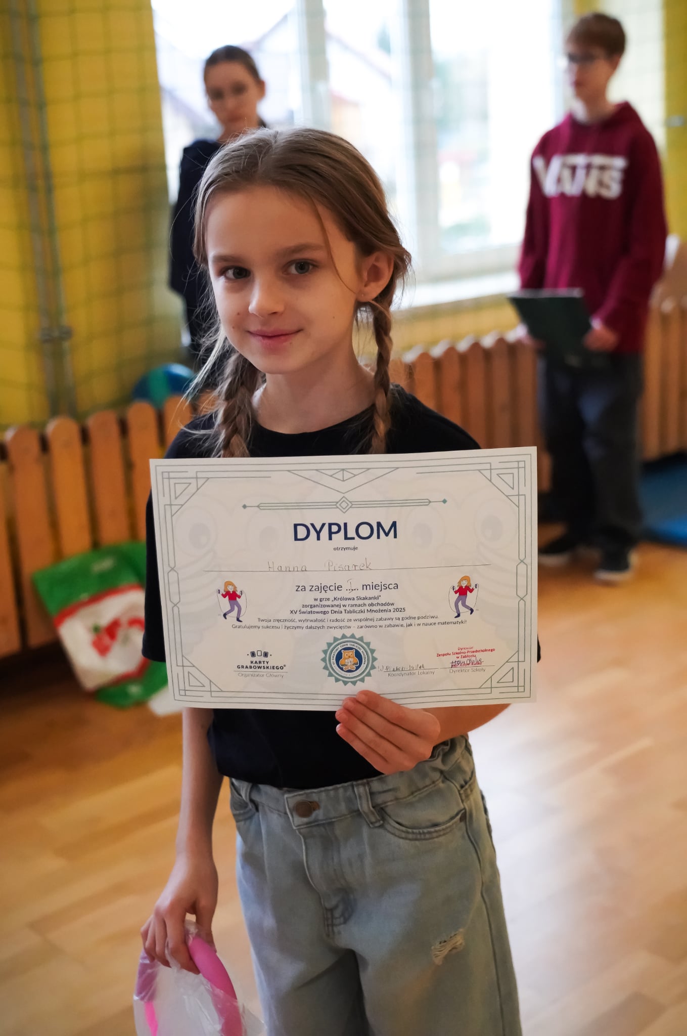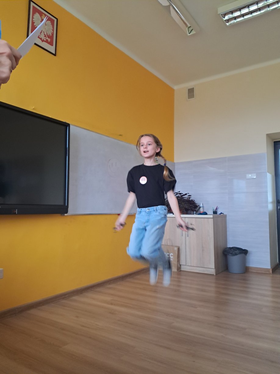 Nie zabrakło również sportowych emocji. W konkurencjach „Królowa skakanki” i „Matematyczny piłkarzyk” uczestnicy musieli nie tylko skakać lub podbijać piłkę, ale jednocześnie podawać poprawne wyniki działań. Okazało się to wyzwaniem naprawdę na wysokim poziomie! Ostatecznie tytuł mistrzyni skakanki zdobyła Hania z klasy 4, a matematycznym piłkarzem został Karol z klasy 8 – ogromne brawa! W swoich kategoriach tytuł mistrza i wicemistrza Tabliczki Mnożenia otrzymali: